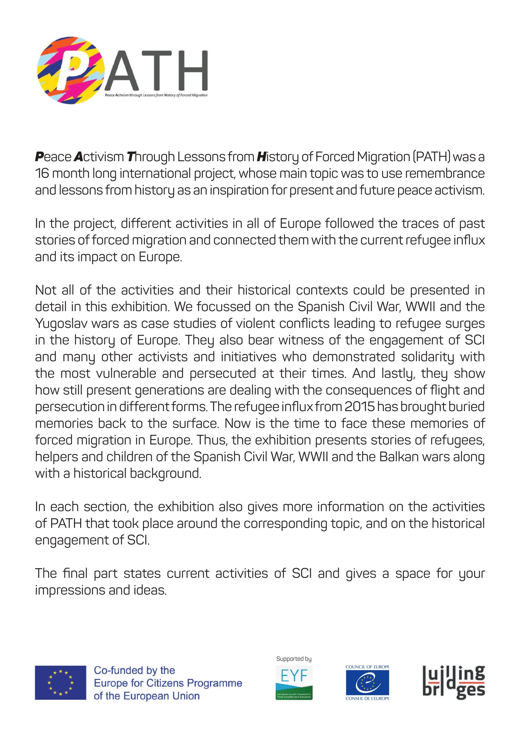 This publication presents stories of refugees, helpers and children of the Spanish Civil War, WWII and the Balkan wars along with a historical background. It was created thanks to contributions of the participants of different activities of the PATH project who followed the traces of past stories of forced migration and connected them with the current refugee influx and its impact on Europe in 2017. It was presented in the form of an exhibition for the first time at the PATH Final event in Sofia, Bulgaria in January 2018. If you would like to show the physical exhibition at one of your events, please contact us.